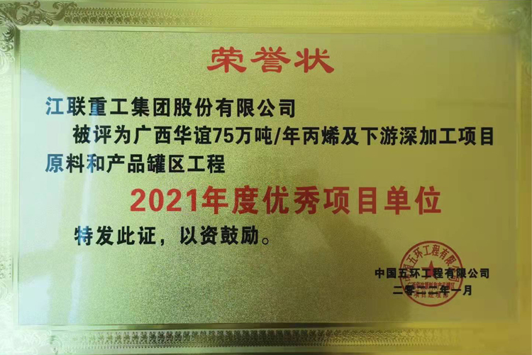近日,公司承建的广西华谊75万吨/年丙烯及下游深加工项目原料和产品罐区工程被中国五环工程有限公司评为“2021年度优秀项目单位”荣誉称号,对公司项目在质量管控、进度等方面取得的成绩给予了充分肯定。