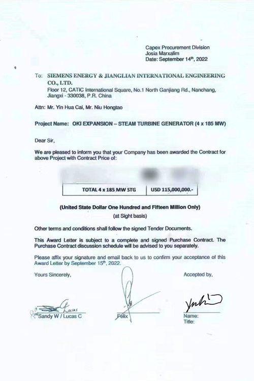 近日,公司海外市场传来喜报,我司收到印尼金光集团新建4x185mw电站项目的中标通知书,中标项目额高达1.15亿美金。历时两年半,5次项目深度优化,19个版本的技术方案更新,100多次专题会议,无数次的电话沟通,为了提供给客户最佳解决方案,为客户的工厂带来最大的经济回报,海外营销团队在此项目上倾尽心血。在投标过程中,三菱集团与中机集团会议室仅与我们一墙之隔,业主同时与三家单位进行谈判。经过多轮多次的会议,凭借我们在金光十多年合作的良好信誉与服务,以及世界领先的最新技术,在高出对手的价格下中标,整个项目的工作范围为设计、采购设备及部分现场服务。
